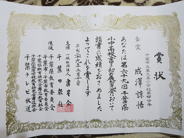千葉県教育委員会、千葉市教育委員会後援の書き初め展覧会にて金賞を受賞しました