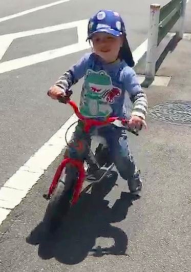 つづいて、キックバイクへ一人で乗れるようになりました。スイスイ進めますね。