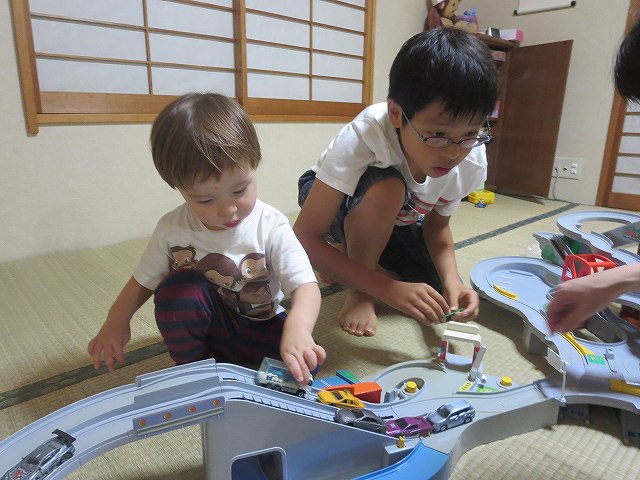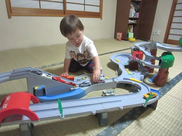 Ryogo兄さんの立体電動道路で沢山の車を走らせて楽しみました